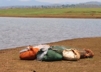 The hook was stuck in something hard. Much tugging revealed remnants of a plastic net. As I pulled in the net, more of it was revealed until I ended up hauling several meters of netting, tangled with deadwood, weeds, and human detritus. Ajaya informed me that every evening, fishermen lined the riverbed with these nets and removed them at dawn, along with the trapped fish. Each day, a large amount of netting was left in the river by the fishermen. He said that the net also often caught juvenile fish, and everyone realised that the fish stock was dwindling. But what option did he have? He barely made a living and had to look after a family of six, including his elderly mother and a newborn baby. When I expressed my horror, he did the Indian head wiggle; equal parts agreement, obsequiousness, and a shrug of helplessness.