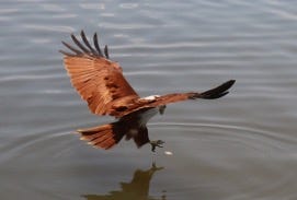 I threw bait into the river. The sky was dotted with Brahmani kites (also known as the red-backed eagle), a magnificent raptor that also scavenges, beautiful in its chestnut-red plumage and sharply contrasting white head and chest. One was particularly adventurous and fearless. As soon as I cast the line, it would swoop majestically on the bait, often catching it in midair. I tried to throw some bait on the other side, away from my cast, but the less intrepid kites covered that area. I feared the kite swallowing the hook or tearing its talons on it, and having been defeated by its persistence and accuracy, I decided to drop the line just by the side of the boat rather than casting it far.