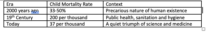 These advances have transformed survival. Here is a brief table of what we have achieved in the last two millennia in just one area of human existence, but a profoundly impactful one: the death of a child. Behind these numbers lie humanity’s extraordinary achievement- how many children now grow into adulthood.